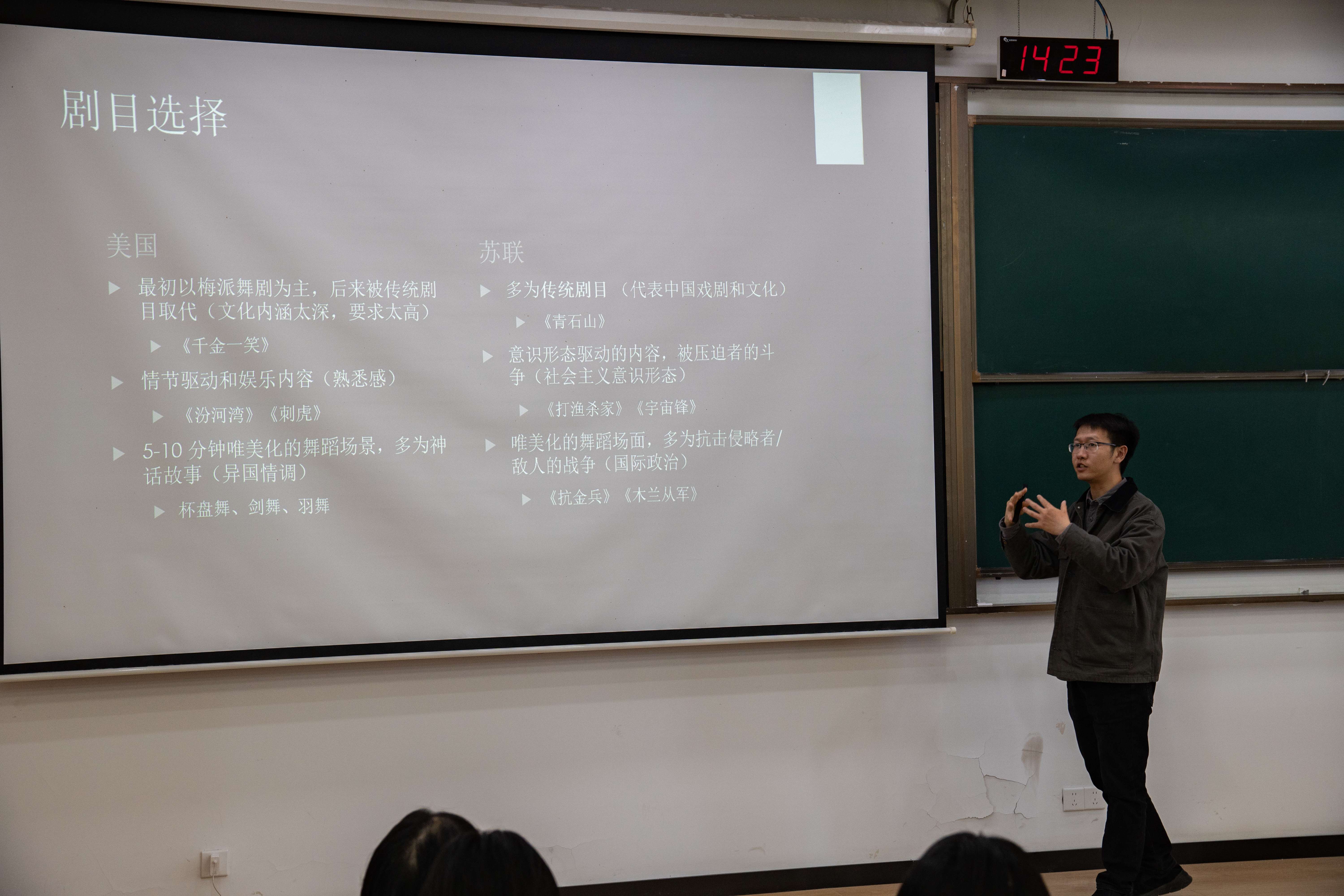 冯伟教授以深厚的学术功底,系统梳理了梅兰芳20世纪30年代访美、访苏公演时期的珍贵史料。通过对比分析宣传材料、媒体报道和剧目选择,生动阐释了跨文化传播中的话语建构策略。冯伟教授特别注重以本科生易于理解的方式呈现研究成果,将复杂的文化课题融入具体案例,引起了在场同学的浓厚兴趣。互动提问环节中,同学们结合自己观看和参与戏剧的体验,就跨文化戏剧翻译中的策略等问题与冯教授展开了深入交流,气氛热烈。