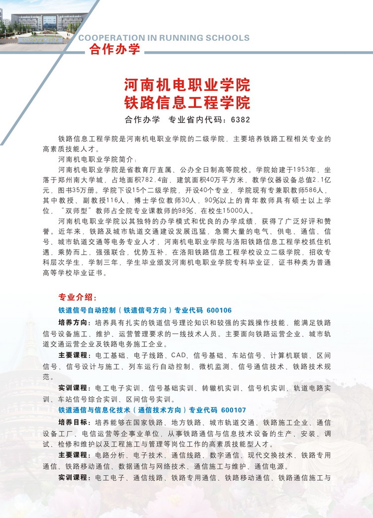 河南机电职业学院以其独特的办学模式和优良的办学成绩,获得了广泛好评和赞誉。近年来,铁路及城市轨道交通建设发展迅猛,急需大量的电务、电气、供电、通信、信号、城市轨道交通专业人才,河南机电职业学院与洛阳铁路信息工程学校抓住机遇,乘势而上,强强联合,优势互补,在洛阳铁路信息工程学校设立二级学院,招收专科层次学生,学制三年,学生毕业颁发河南机电职业技术学院专科毕业证,证书种类为普通高等学校毕业证书。