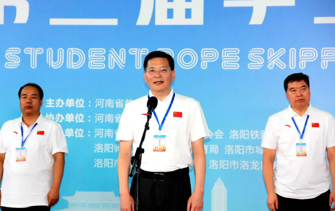 河南省教育厅总督学刘林亚,河南省教育厅体卫艺处处长聂世忠,洛阳市教育局党组成员、副局长乔思军,洛阳市体育局副局长牛宏亮,河南省学生体育总会跳绳协会主席、洛阳铁路信息工程学校党委书记李林榕出席开幕式。来自全省各大中小学校、幼儿园四个学段的856名运动健儿冒着高温酷暑奋力拼搏,展现出一场场高水平的较量。