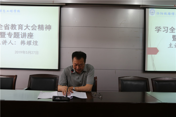 会上,校长韩耀煌向全校职工传达了全省教育大会精神。他讲到,全省教育大会是省委省政府在我省全面建设小康社会进入关键时期召开的一次十分重要的会议。大会提出了加快教育现代化、建设教育强省的目标任务,振奋人心,鼓舞士气;大会还出台了《全面深化新时代教师队伍建设改革的实施意见》,强调落实立德树人根本任务,并针对想解决而未能解决的实际问题和困难出台了一系列政策措施,有效提升了教师的政治、社会和职业地位,增强了教师的幸福感、成就感和荣誉感。另外,本次大会的规格之高、参会范围之广、政策力度之大都足见省委省政府对加快推进教育现代化、建设教育强省、办好人民满意教育的决心,同时也让我们对学校各项事业的蓬勃发展充满了信心。