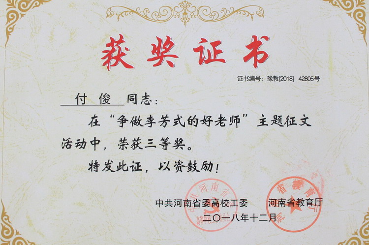 近日,我校教师李龙玉、付俊在河南省教育厅开展的“争做李芳式的好老师”师德主题征文活动中,分别荣获第三名的好成绩。