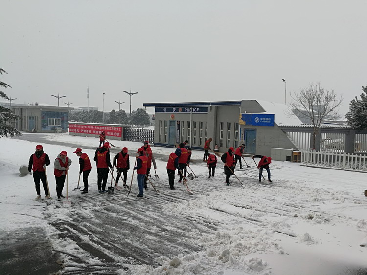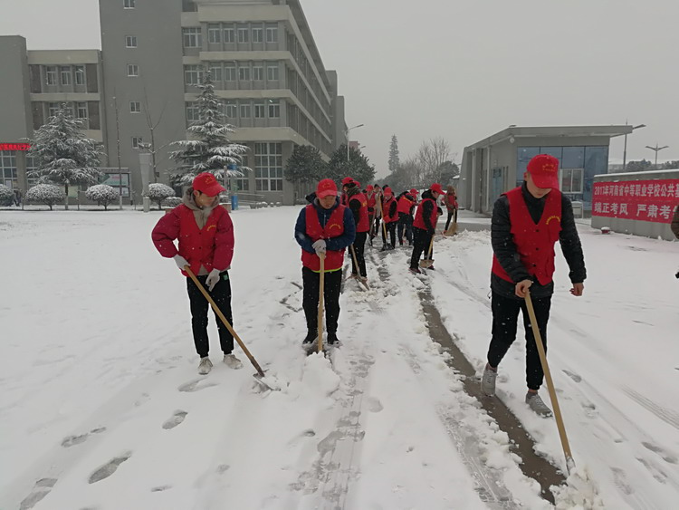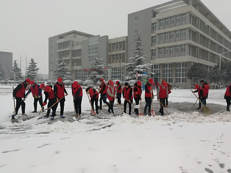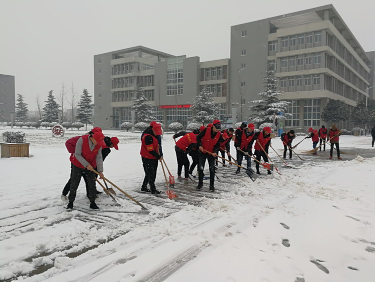 在清除积雪的过程中,志愿者们齐心协力,不畏寒冷,先后将教学楼、实训楼、图书信息楼、餐厅等影响出行的积雪清扫得干干净净。