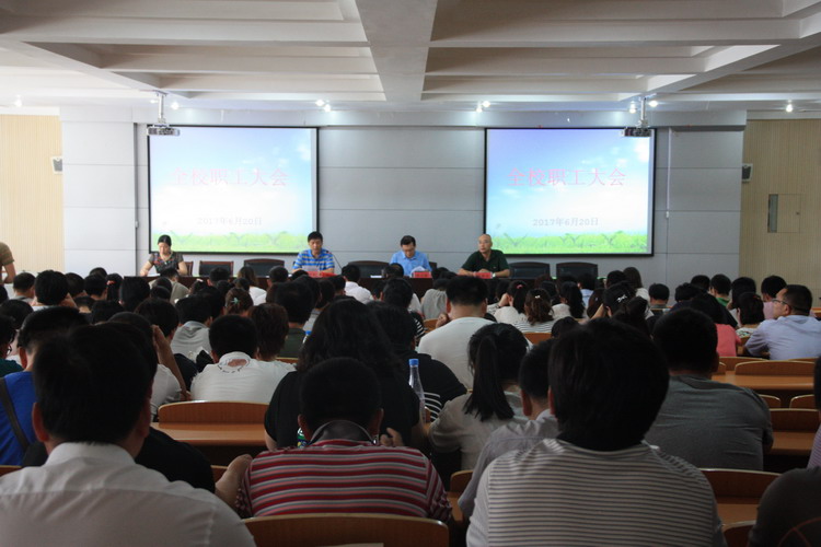 6月20日下午,我校在多功能报告厅召开期末全校职工大会,全体教职工参加。会议由党办主任郭建丽主持。 会上,常务副校长王怀钦宣读我校青蓝工程、优质课评比活动获奖名单,并为获奖教师颁发荣誉证书。 副校长杨建光详细讲解了即将开始的招生工作中需注意的事项,要求大家按照学校规定规范招生,公布了我校招生工作再获省级先进的喜讯,并就此项工作取得的成绩对全体职工表示感谢。 党委书记陈云峰对2017上半年学校及各科室完成的各项工作进行了全面总结,充分肯定了工作中的亮点,指出了工作中存在的问提,对下学期的工作提出了要求,并祝全体教职工愉快度假,平安返校。