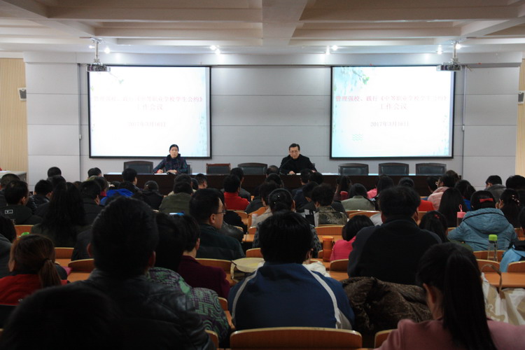 3月16日下午4:30,我校在一号实训楼二楼多功能报告厅召开管理强校、践行《中等职业学校学生公约》工作会议暨党风廉政建设工作会议,全校教职工参加,会议由党办主任郭建丽主持。