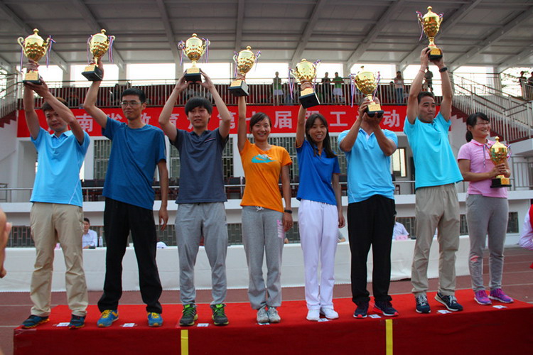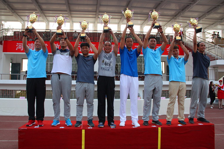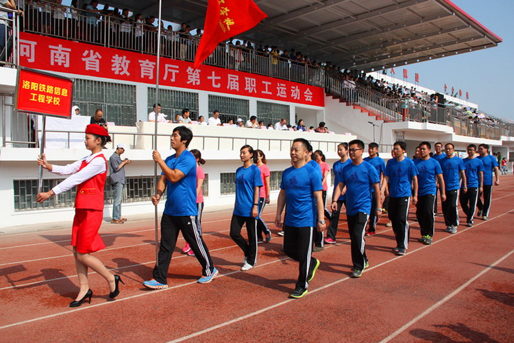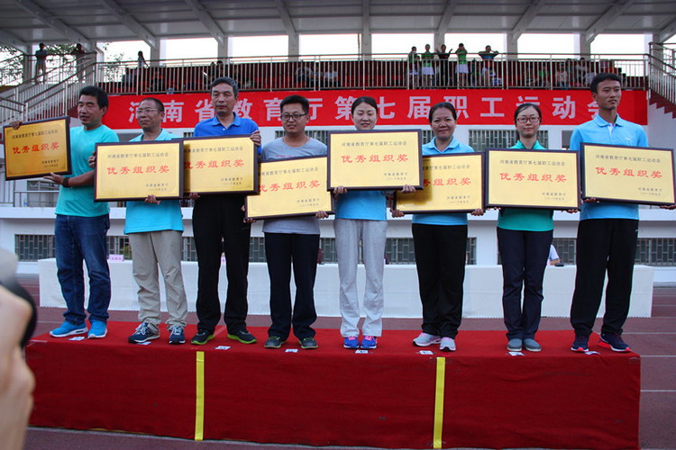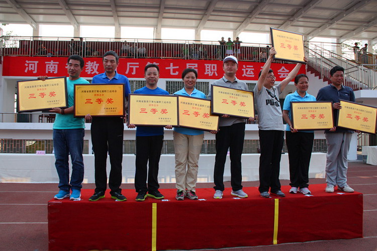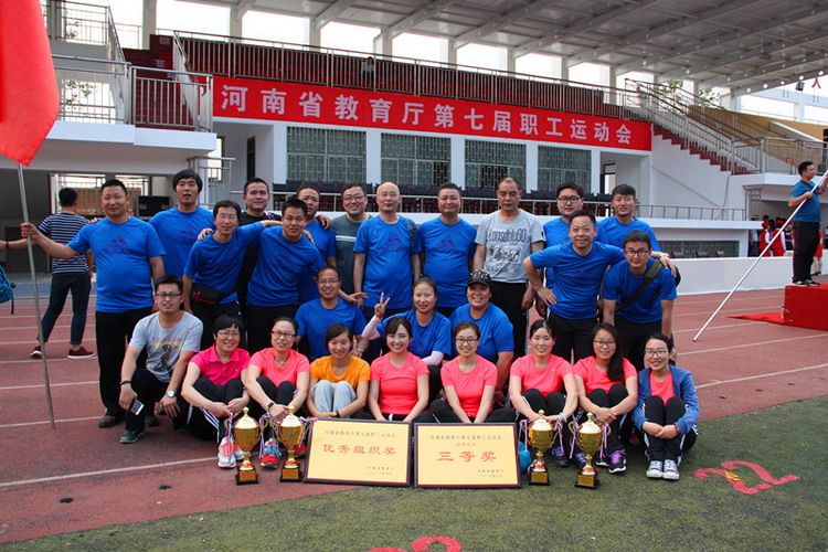 5月28日,河南省教育厅第七届职工运动会在河南应用技术职业学院举行。省教育厅副厅长、党组成员刁玉华、任峰、尹洪斌,省委高校纪工委书记、纪检组长、党组成员李莉华,厅党组成员、省招生办公室主任、党委书记朱玉山参加了开幕式。我校由副校长史亚非带队参加了此次体育盛会。 (主席台) (我校代表队入场) (开幕式广播体操表演,我校左二红队) (拔河比赛) 本届运动会共有教育厅机关和厅直属单位组成的27支代表队参加,我校体育健儿继续发扬“更高、更快、更强”的奥运精神,奋力拼搏,再创佳绩。取得了毛毛虫竞速比赛第三名,拔河比赛、袋鼠运瓜比赛第四名,五人制篮球赛第五名,最终我校获得团体总分三等奖和优秀组织奖。 (毛毛虫竞速比赛) 运动会合影留念 副校长李文光(左四)代表我校领取五人制篮球赛五等奖 副校长史亚非(左三)代表我校领取团体总分三等奖 通过参加此次运动会,增进了我校与兄弟单位的沟通与交流,展现了我校教职工的良好精神风貌。 副校长史亚非(右四)代表我校领取拔河比赛四等奖 校办副主任熊国雷(左四)代表我校领取优秀组织奖 臧嘉琪老师(右三)代表我校领取毛毛虫竞速比赛三等奖 孙青青老师(左四)代表我校领取袋鼠运瓜比赛四等奖
