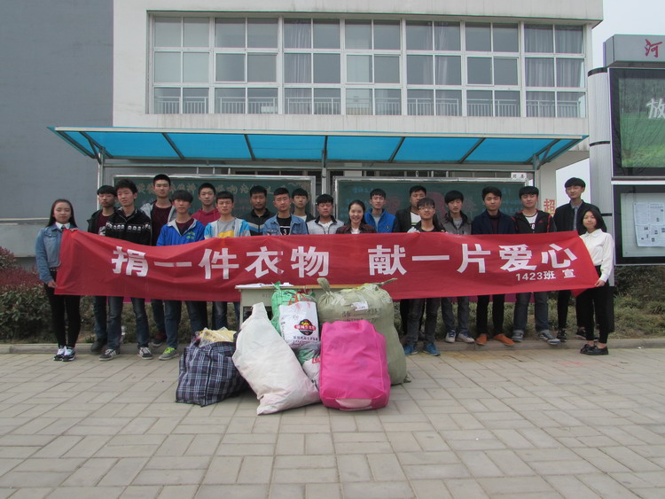 2016年3月14日至2016年3月22日,1423班在校团委的带领和号召下,开展“捐一件衣物,献一片爱心”雷锋月募捐旧衣物志愿活动。