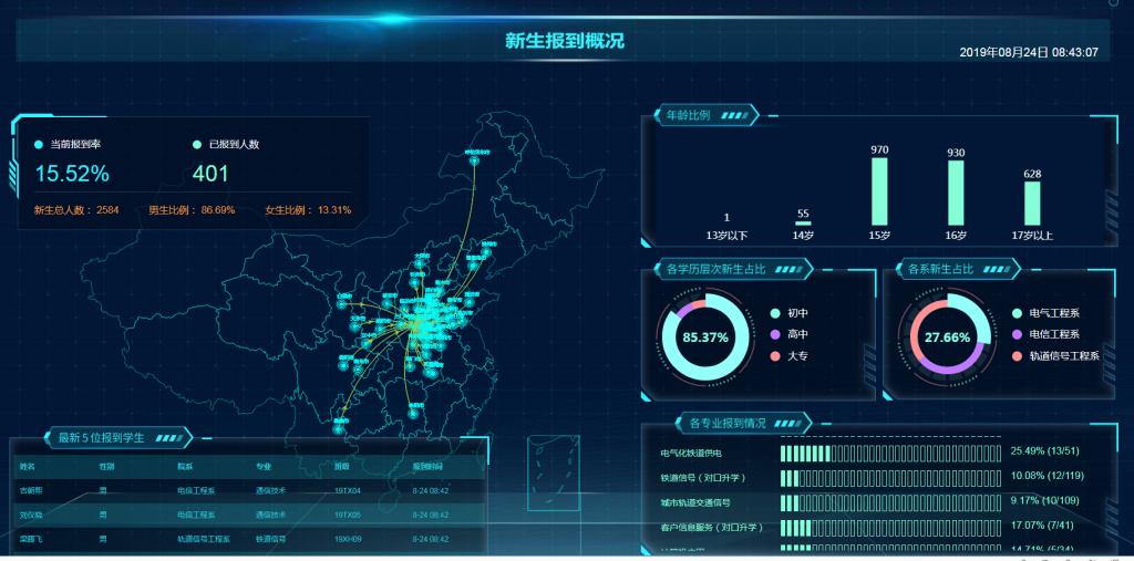 大数据及微应用项目,采用了主流的大数据分析Hadoop架构,建立了学校数据中心,通过数据治理引擎对学校各项工作产生的实时数据进行全量接入、清洗、存储,形成我校的数据资产。在此之上,利用Spring Cloud微服务架构,重新按使用特点构建了新的招生迎新、学籍管理、德育评价、校友管理等四个全定制化微应用。并将用户前台全部集成在手机微信端,实现面向用户、便捷服务。项目组和开发部门克服时间紧、个性化强的困难,强力推进微信报名端率先在今年7月新生报名工作中投入使用,极大的方便了学生报名,也减少了学校对新生信息的统计汇总工作量。在新生报到期间,迎新模块充分展示了其高效、便捷的功能,彻底解决了以往新生报到中报名、资格审查、现场交费、分配宿舍等多环节、排长队的局面。报到前,学生通过手机简单查询即获得相关录取信息,到校后只需要到系进行注册即可直接到班级、宿舍。与此同时,今年与河科大、郑铁职等高校同步启用的学生报到大数据,通过大屏幕面向家长、学生展示,直观明了,科技感十足。