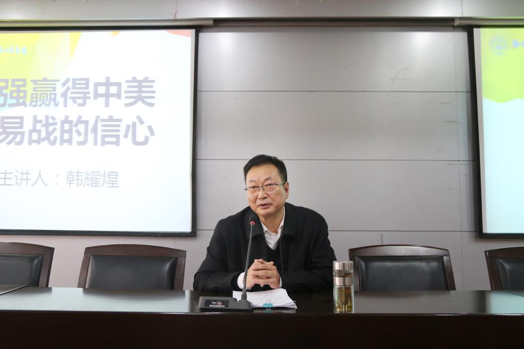 授课中,韩耀煌引经据典,深入浅出地反驳了网络上出现的关于中美贸易摩擦的三种错误观点。同时,旗帜鲜明地提出,面对当前复杂多变的国际形势,打赢中美贸易战,坚持党的领导,坚持走中国特色社会主义道路是根本保证;中国人民的智慧和不怕牺牲的精神是主要基础;越来越强的国力和人民的自信底气是主要保障;个人做好本职工作,为国家培养更多高质量的建设人才是内生动力。
