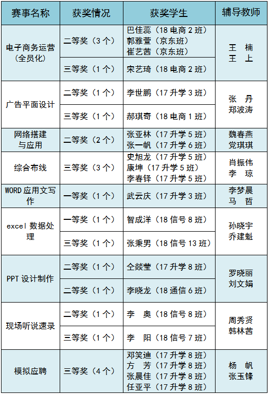 我校学生在河南省中等职业教育技能大赛电子商务运营(全员化)、广告平面设计、网络搭建与应用、综合布线等信息技术类比赛中荣获二等奖6个,三等奖5个;在第五届河南省中等职业学校学生素质能力大赛应用文写作、EXCEL数据处理、PPT设计制作、现场听说速录、模拟应聘等计算机基础类比赛中荣获一等奖2个,二等奖3个,三等奖6个。