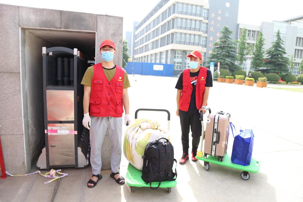 学生工作部、总务科、电气工程系、轨道信号工程系、电信工程系、校团委等部门的工作人员正在根据学校疫情防控工作方案要求,紧张有序地引导分流人员车辆、对学生行李进行消毒、帮助学生搬运、查验健康码、检查返校承诺书、测量体温、核对名册。