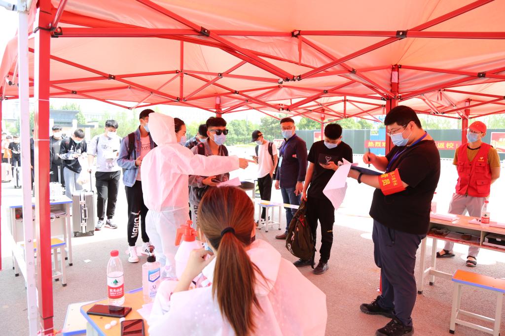 在宿舍门入口,返校学生按照地面相关标识依次排队,正在宿舍工作人员的指引下登记基本信息,进行手部消毒,有序进入。
