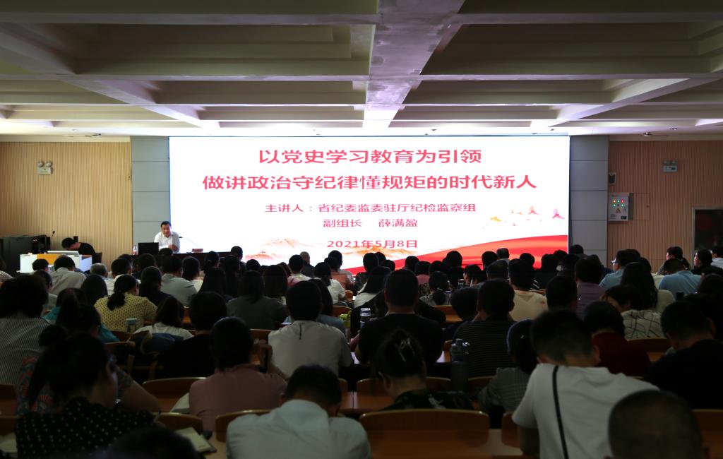 5月8日下午,省纪委监委驻省教育厅纪检监察组副组长薛满盈同志在思政大讲堂为全校职工讲授题为《以党史学习教育为引领 做讲政治守纪律懂规矩的时代新人》专题讲座,讲座由校党委书记李林榕主持。