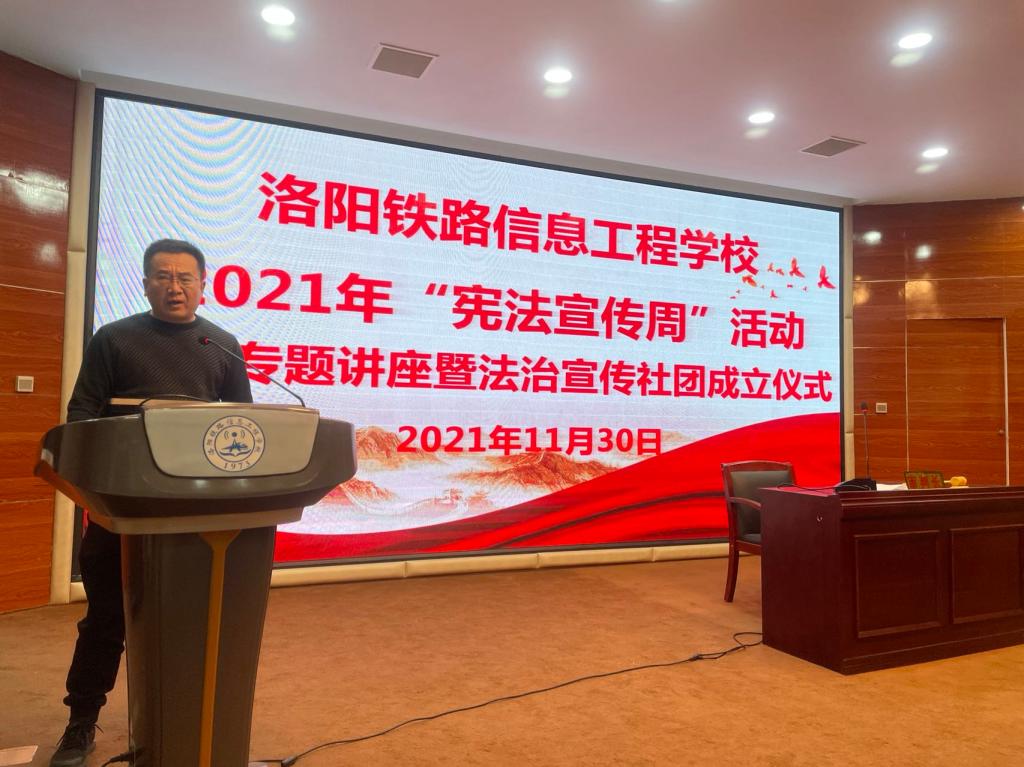 11月30日,我校在智慧大讲堂举行2021年“宪法宣传周”活动宪法专题讲座暨法治宣传社团成立仪式,副校长于庆斌,河南义同律师事务所律师李亚飞、马笑珂及师生代表参加,活动向全校直播。
