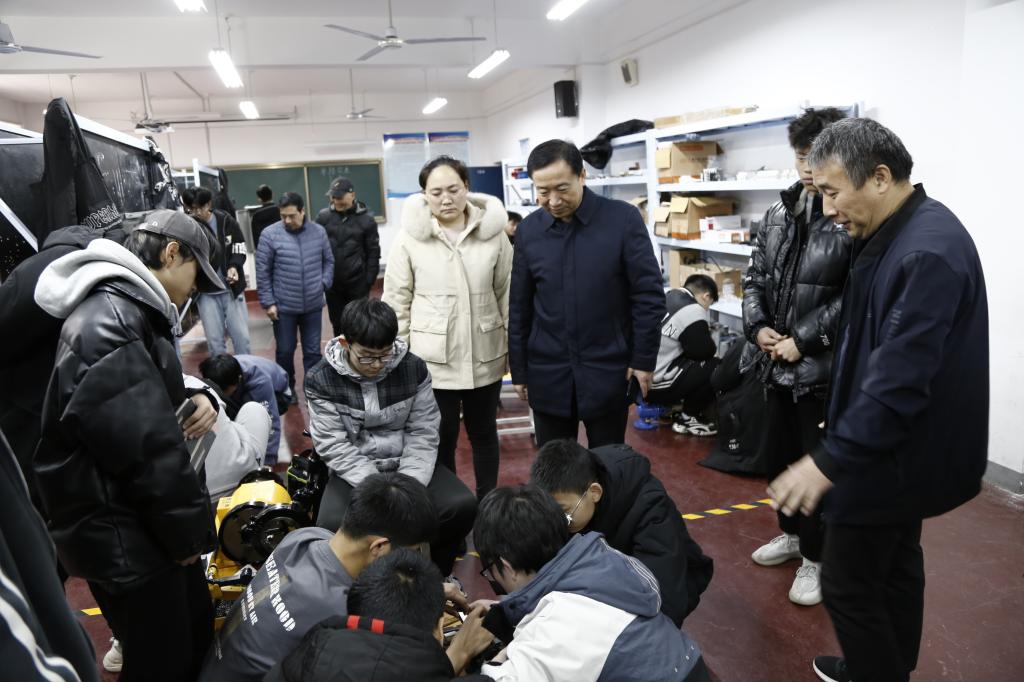 赵亚军一行先后参观了学校风水电专业实训室、接触网实训室、钳工实训室高低压演练场、洛铁站实训中心等实训场地。