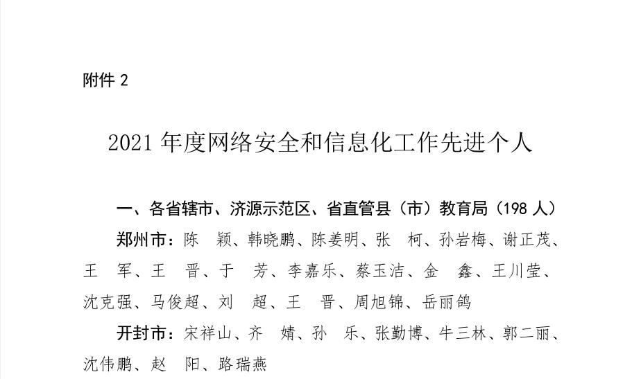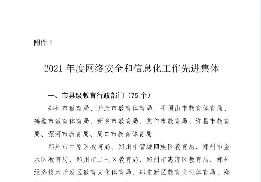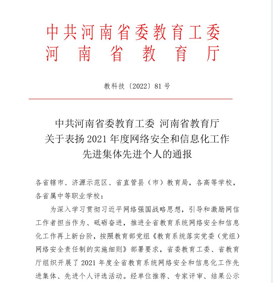 近日,中共河南省委教育工委、河南省教育厅发布《关于表扬2021年度网络安全和信息化工作先进集体先进个人的通报》(教科技[2022]81号),我校被评为2021年度河南省教育系统网络安全和信息化工作先进集体,我校职工邱智铖荣获2021年度网络安全和信息化工作先进个人。