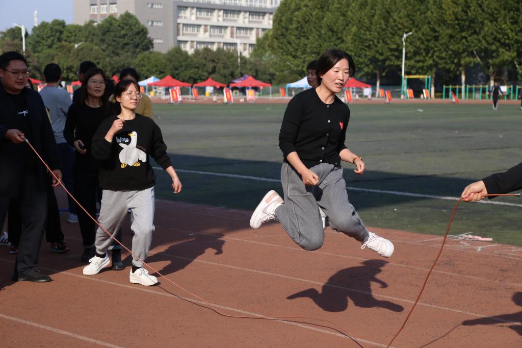 比赛由校工会主办,设单人跳绳和集体跳长绳两个项目,来自8个分工会的140余名教工参加了比赛。