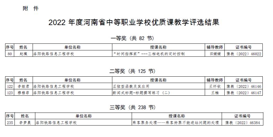 近日,河南省教育厅公布了2022年度河南省中等职业学校优质课教学评选结果。我校电气工程系赵璞主讲的《“时间指挥家”--三相电机的定时控制》获一等奖;公共教学部李娅君主讲的《正弦型函数及其应用》、信息工程系穆雅菲主讲的《新闻式标题-标题撰写练习》获二等奖;电信工程系李梦晨主讲的《乘客票务处理——乘客持票不能进站问题的处理》获三等奖。