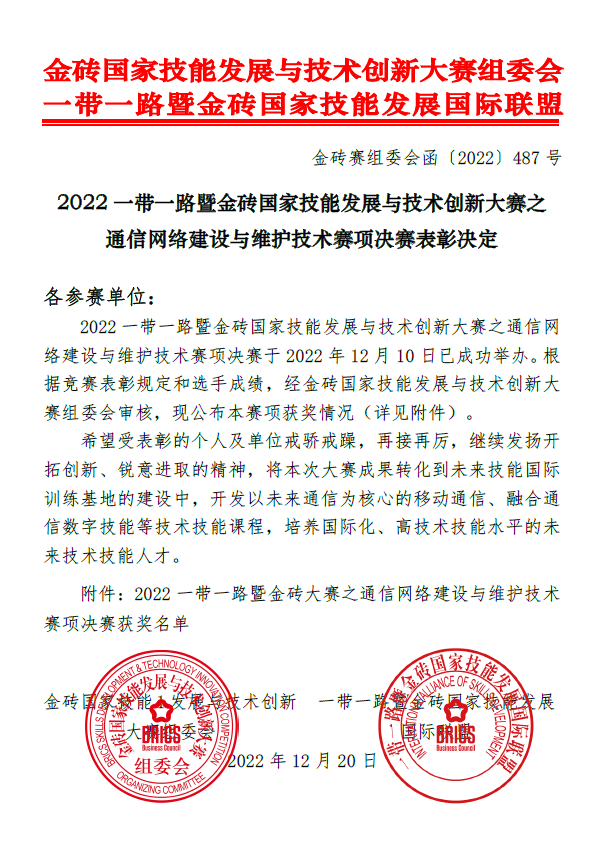 12月10日,2022年一带一路暨金砖国家技能发展与技术创新大赛“通信网络建设与维护技术赛项”全国总决赛顺利闭幕。经过激烈角逐,我校教师队伍李杰、梁晓荣获职工组一等奖,学生队伍郭笑颜、张亚林荣获高校组二等奖,我校荣获“最佳组织奖”称号。