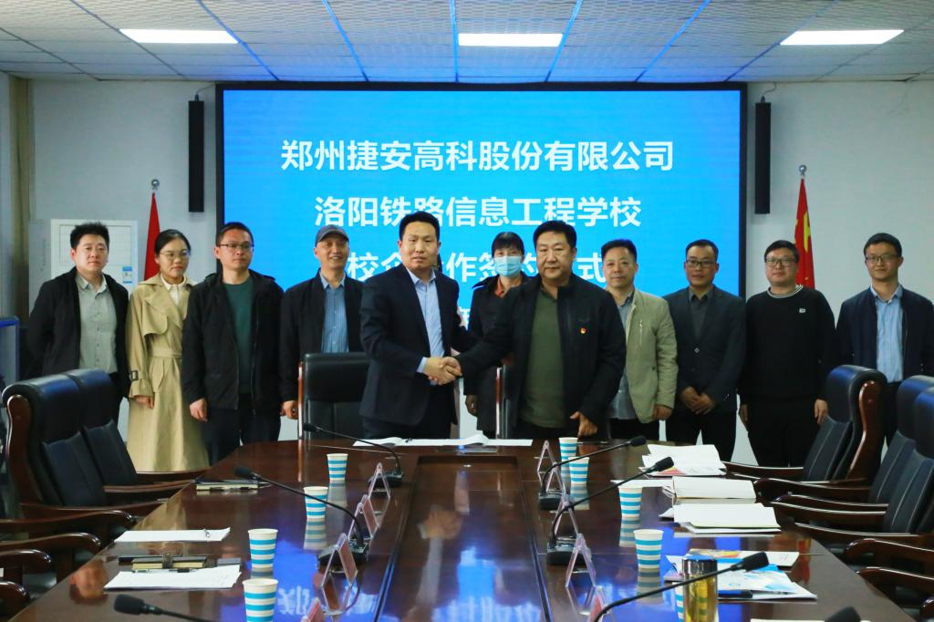 3月15日,郑州捷安高科股份有限公司副总经理翟艳臣一行,莅临我校洽谈校企合作事宜,签约仪式在图书信息楼四楼会议室举行。校党委书记李林榕、常务副校长王怀钦、纪委书记郭青、副校长史亚非及轨道信号工程系相关负责人参加仪式。