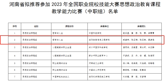 近日,河南省教育厅发布了《关于公布河南省拟推荐参加2023年全国职业院校技能大赛思想政治教育课程教学能力比赛(中职组)名单的通知》,我校臧嘉琦、张亚楠、张玉锋、桑彦彪思政教师团队脱颖而出,将代表河南省参加2023年全国职业院校技能大赛思想政治教育课程教学能力比赛(中职组)国赛。至此,本年度我校师生已相继入围2023年全国职业院校技能大赛3个赛项的国赛,取得了近年来的最佳成绩。