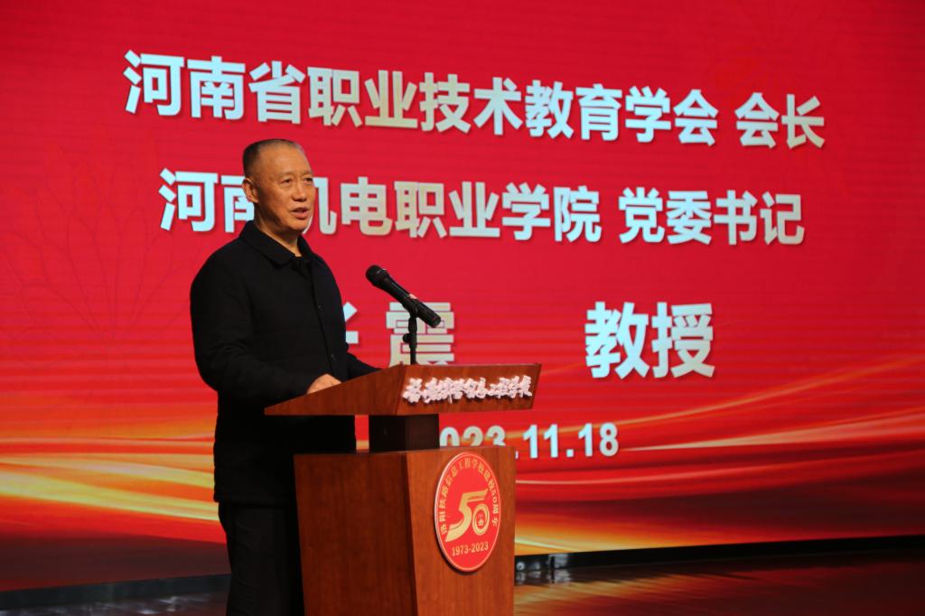 朱自锋在大会上致辞。朱自锋代表省委教育工委、省教育厅向学校建校50周年和洛阳城市轨道交通职教联盟成立表示热烈的祝贺,向长期以来关心洛阳铁路信息工程学校、支持河南省职业教育发展的洛阳市委市政府及社会各界朋友表达由衷的谢意。