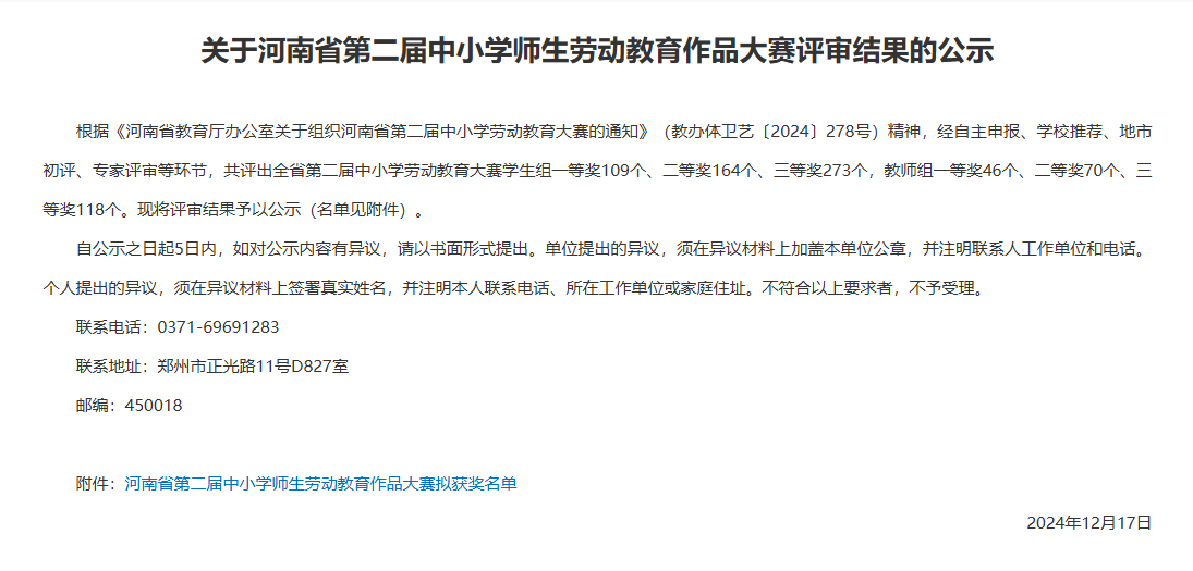 12月17日,河南省教育厅公布了河南省第二届中小学师生劳动教育作品大赛评审结果,我校在本次活动中取得了可喜成绩,共有12件作品获奖,其中一等奖3个,二等奖2个,三等奖7个。