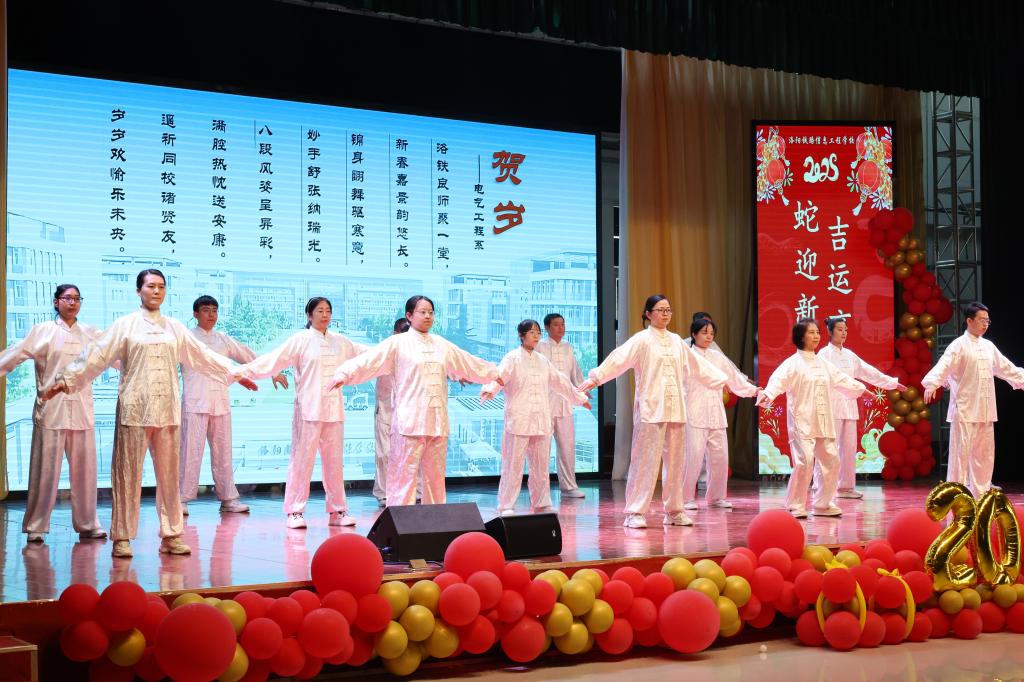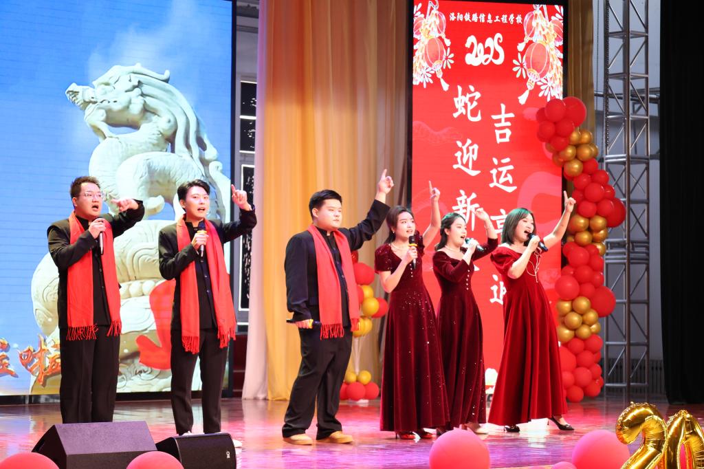 校领导表演的歌曲《我们走在大路上》拉开了团拜会文艺演出序幕。信息工程分工会老师带来的舞蹈《上春山》展现了春天的美丽景色,对春天踏青的愉快心情的描绘,充满了温暖和正能量;行政第一分工会古筝独奏《战台风》展现了洛铁人不畏艰难、勇敢豪迈的气魄和对未来必胜的信念;东校区带来的歌曲《我们都是追梦人》鼓励大家无论面临多大的困难和挫折都要追寻自己的梦想;电气工程分工会带来的八段锦,通过八个特定的动作来调理身体,达到强身健体、提高免疫力、预防疾病的目的;行政第二分工会带来的口技表演,惊艳到了现场的每位观众;电信工程分工会、公共教学分工会带来的独唱《悟空》《月半小夜曲》深受职工好评,电信工程分工会带来的舞蹈《教师阵线联盟》和轨道信号工程分工会的朗诵《骄傲的洛铁人》一次又一次将团拜会推上了高潮,现场还设置了幸运职工抽奖环节和游戏环节,惊喜连连,充满欢声笑语。团拜会在大合唱《歌唱祖国》的歌声中结束。
