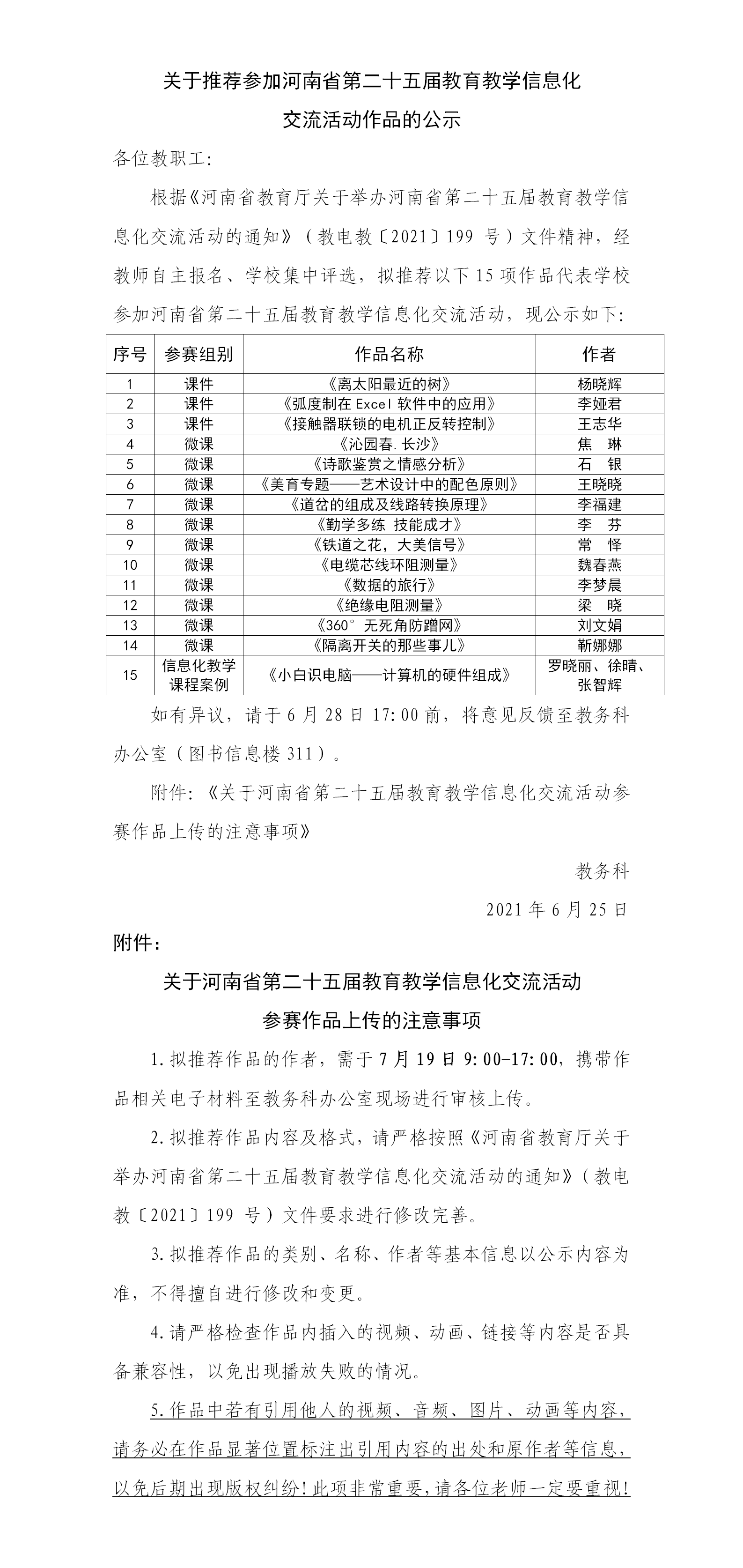 关于推荐参加河南省第二十五届教育教学信息化交流活动作品的公示