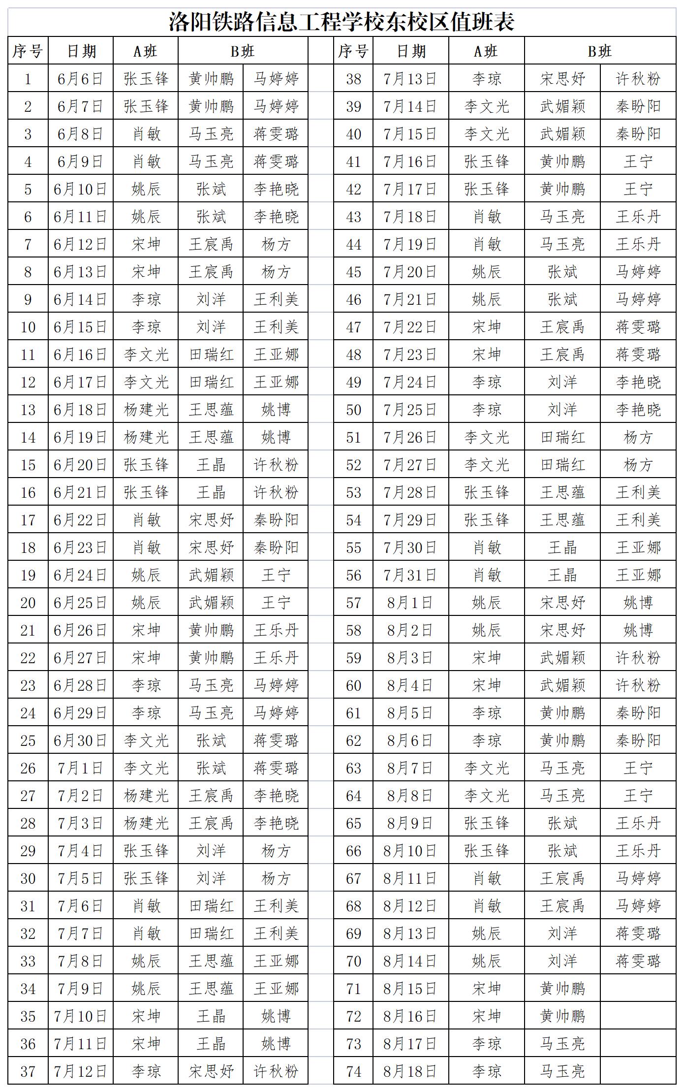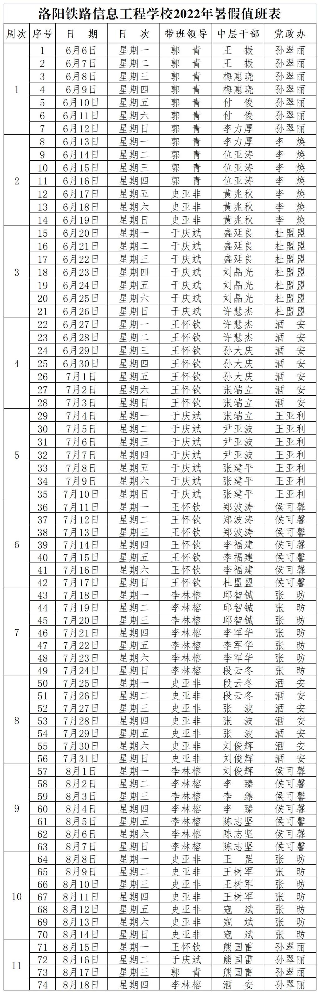 附件:洛阳铁路信息工程学校2022年暑假值班表