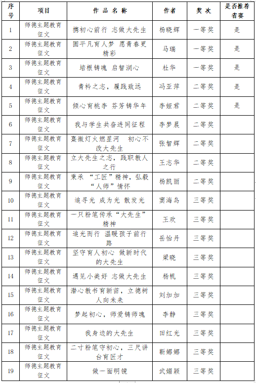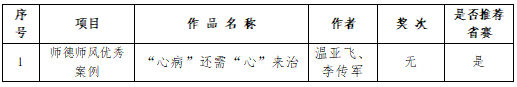 由于报送作品数量较少,本次校内师德师风优秀案例不再进行奖次评选,直接推荐以下作品参加省赛: