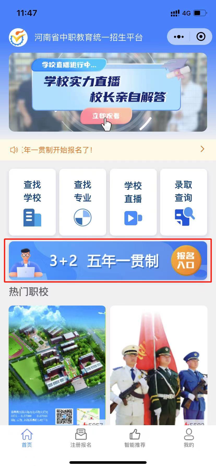 1、登录“河南省中职教育统一招生平台”,点击“3+2 五年制一贯制”报名入口。
