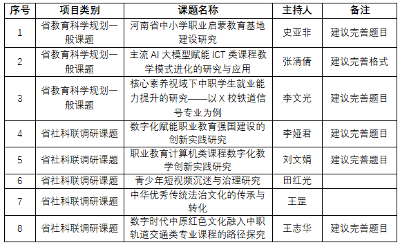 根据《河南省教育厅办公室关于开展河南省教育科学规划 2024年度一般课题申报工作的通知》和《河南省社会科学界联合会关于组织申报河南省社科联2024年度调研课题的通知》文件精神,学校组织开展了相关申报工作。经个人申报、学校评审,拟推荐以下课题参与省级立项工作,现公示如下: