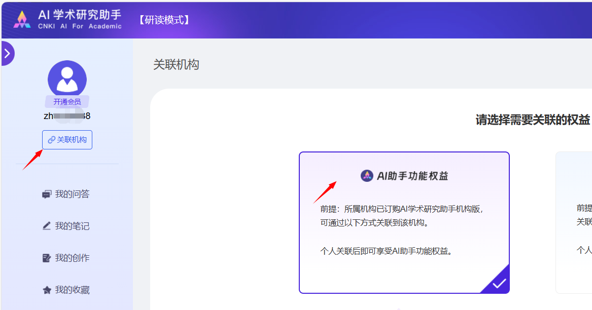 操作步骤:打开https://aiplus.cnki.net 登录已注册的知网个人账号,点击右上角账号进入个人中心--我的订单--关联机构,选择AI助手功能权益。