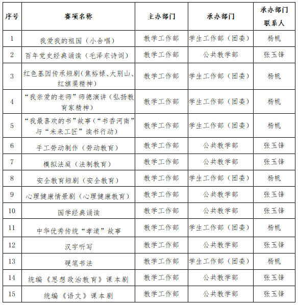 (七)各教学部门应严格按照省教育厅文件及学校要求,督促各项赛事的辅导教师(组)组织开展相关活动,按时提交相关赛事资料。如因个人原因没有按时提交相关资料的,不予统计竞赛奖励。