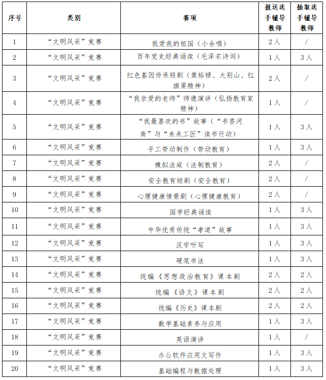 本次“文明风采”竞赛各赛项前期辅导教师报名、后期选拔、培训、参赛等工作由教学工作部统筹主办,相关系部负责承办,有意参赛的教师可以向各赛项承办部门报名参加遴选,具体安排如下: