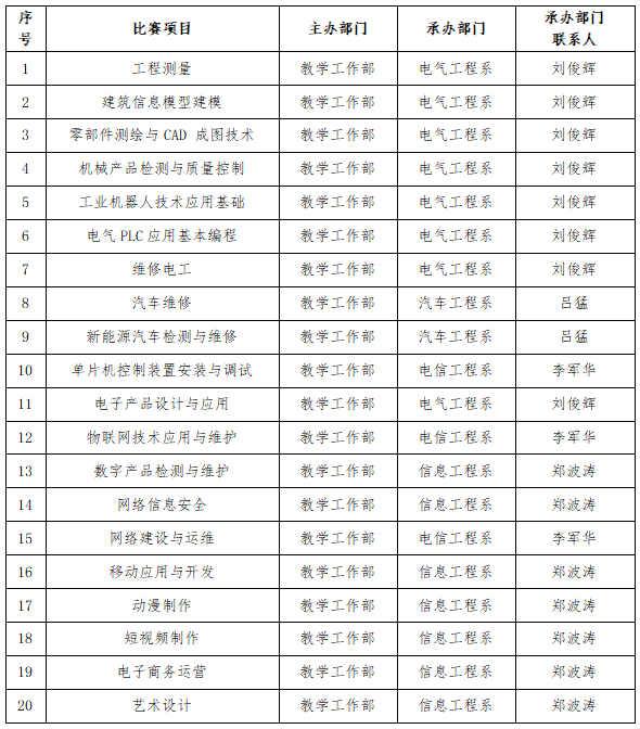 本次技能大赛校内选拔赛由教学工作部主办,各教学部门承办,其他相关部门协助,有意参赛的教师可以向承办部门报名参加遴选,具体安排如下: