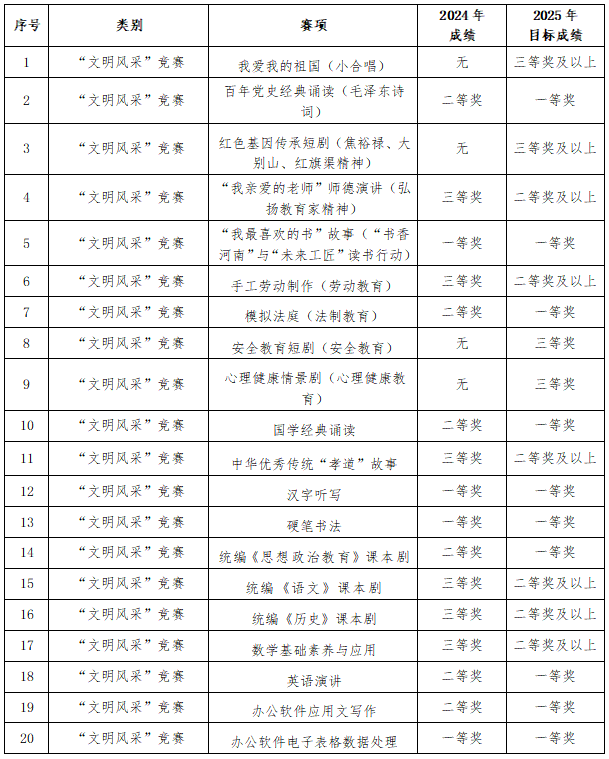 (四)承接技能大赛备赛任务的教学部门应结合自身专业优势,组建优质指导教师团队,着力孵化培育至少1项国赛赛项;各教学部门应认真督促各指导教师(组)按照需严格执行《洛阳铁路信息工程学校竞赛管理与奖励实施办法》文件要求,做好各项赛事准备工作,保质保量完成选手的日常培训和辅导,力争在本年度的省赛中完成以下成绩目标的突破: