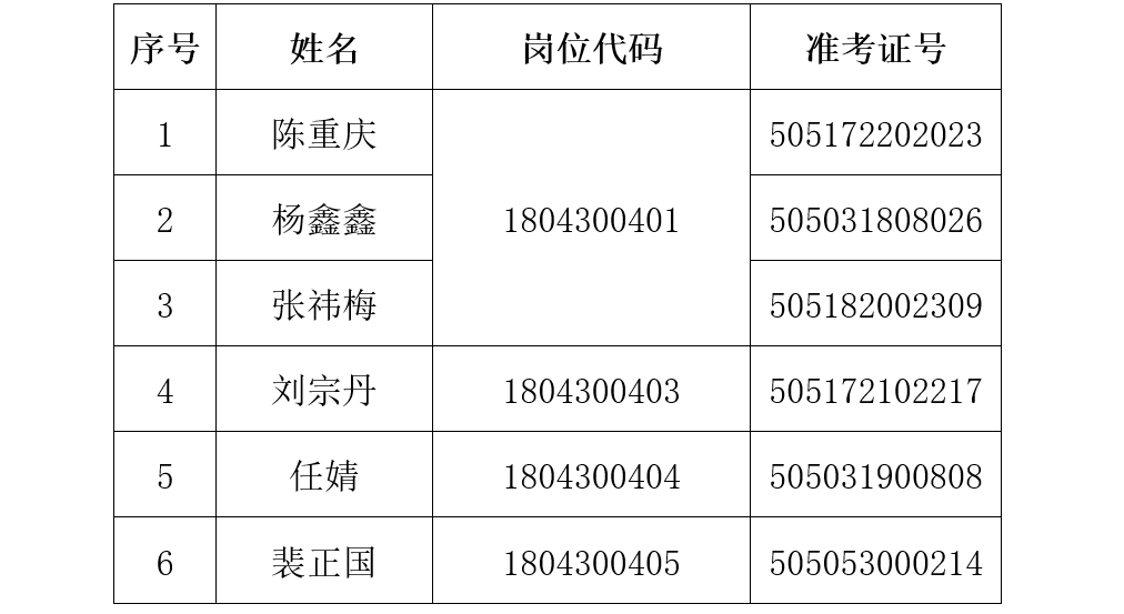 根据各专业应聘人员的总成绩及排名,按照体检人员与招聘岗位数1:1的原则,确定以下6名考生进入体检环节: