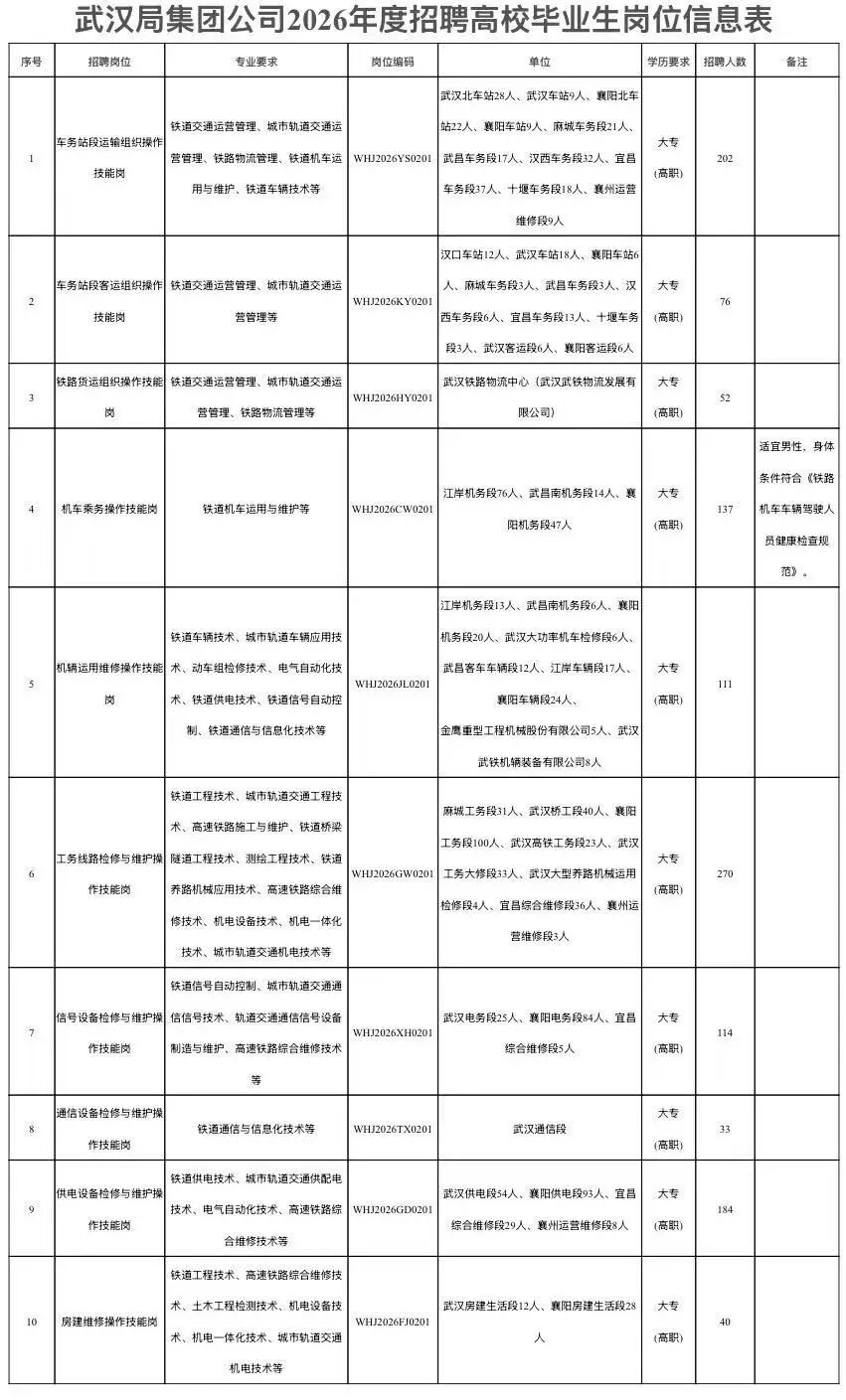 中国铁路武汉局集团有限公司根据经营发展需求,拟招聘全日制普通高等院校大专(高职)学历毕业生,现将有关事项公告如下: