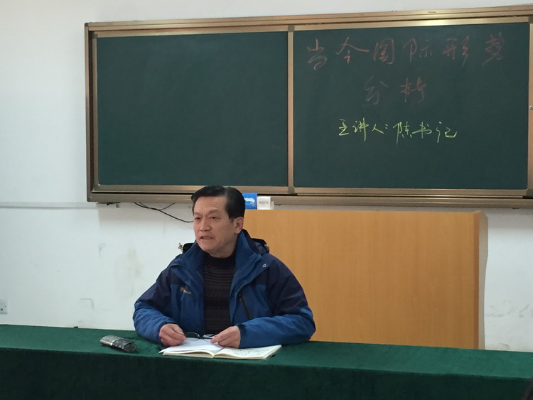 下午4点30分,课程正式开始,陈书记主讲题为《当今国际形势分析》。陈书记以连续发问的方式开场,与同学们进行了积极而又有针对性的互动,使同学对国际形势开始有了比较清晰地认识。在总结环节,陈书记谈到:高瞻远瞩才能层层推进,仰望星空才能脚踏实地。关注国际形势,不仅是为了了解新闻、听故事,更重要的是为国家发展、个人发展提供有益的参考,同时也能锻炼一个人的大局观、统筹观,所谓“不谋全局者,不足谋一域”,即是如此。