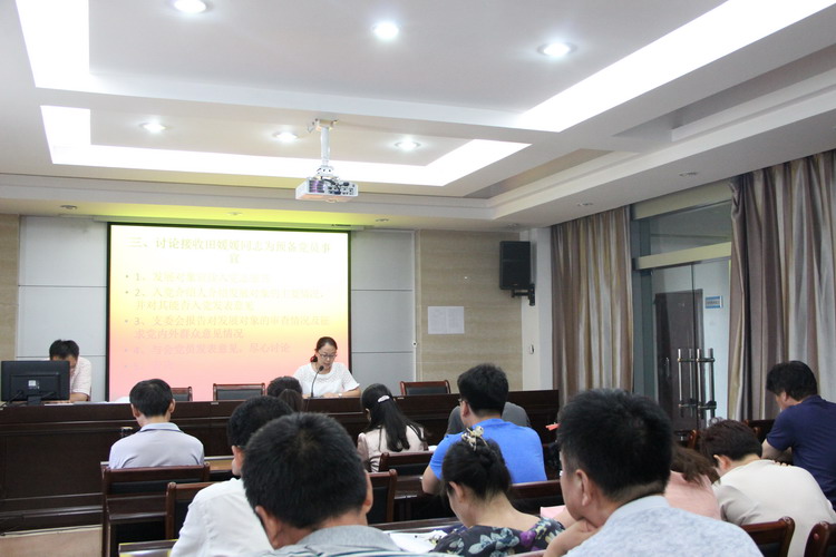 本次大会主要讨论张建平同志由中共预备党员转为中共正式党员,接收田媛媛同志为中共预备党员事宜。根据《中国共产党发展党员工作细则》,张建平同志向大会汇报了预备期间的工作表现,田媛媛同志宣读了入党志愿书,报告了个人情况,他们二人的入党培养人也向大会报告了培养意见,尹亚波书记代表教务党支部宣读了支部意见,经过征询大会党员意见,到会党员表决,一致同意张建平同志转为正式党员,接收田媛媛同志为中共预备党员。
