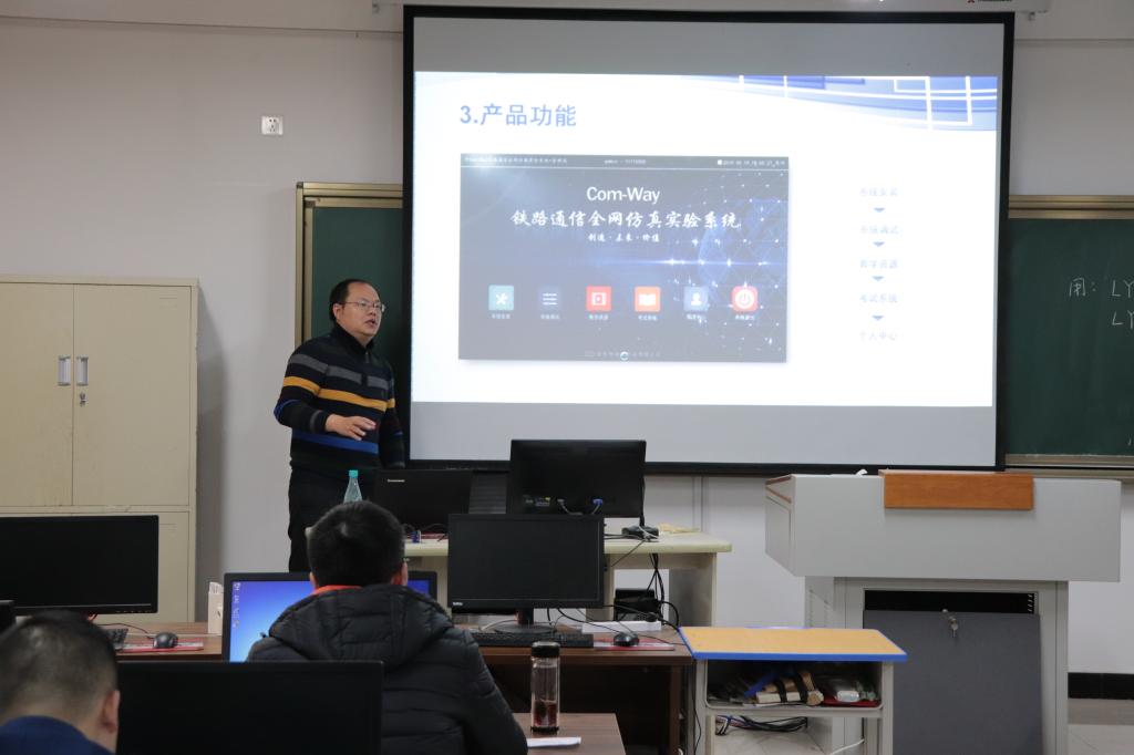 随后,我校电信工程系与南京柯姆威公司在2号教学楼323教室召开了专业建设和实训室建设研讨会。南京柯姆威公司副总经理彭永龙向大家介绍了铁路通信全网仿真实验系统,并开通账号组织与会教师进行体验。