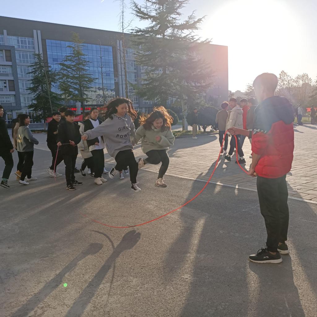 比赛在校园前广场进行。只见,一根根绳子飞舞,一个个选手连绵不断的“飞驰”而过,一张张纯真的笑脸在绳子的舞动下闪烁着光芒。参赛同学配合默契,同心协力,表现出了不凡的实力和志在必得的信心。