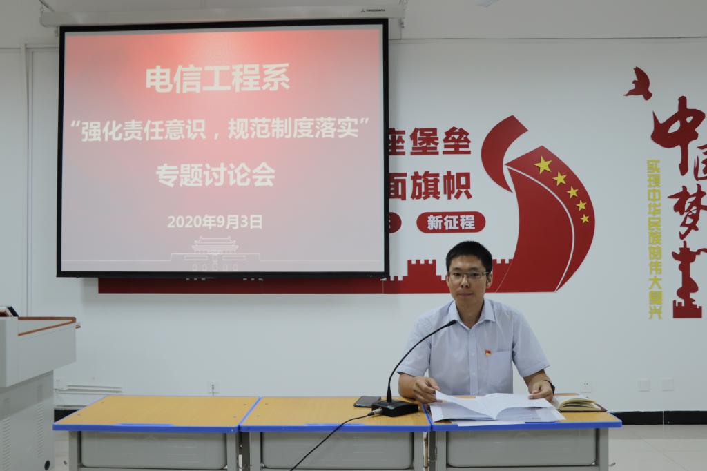 接着,张波又主持召开了“强化责任意识、规范制度落实”专题讨论会。他首先对学校下发的《在以案促改中开展“强化职责意识,规范制度落实”专项治理整改工作方案》做了详细说明,对接下来的工作做了具体安排。随后,按照文件统一要求,系里每名教师紧紧围绕“党章党规教育月”和文件附件2的学习内容,做了主题发言,谈了自己的学习体会。张波在最后的总结中谈到,强化责任意识、规范制度落实要坚持做到:一是树立终身学习观,二是坚持精细化管理,三是强化组织纪律性。