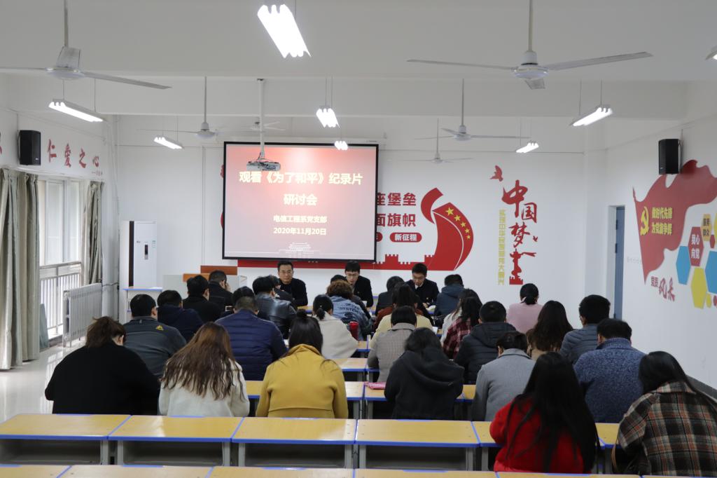 11月20日下午,电信工程系党支部在党员活动室组织全体教职工召开了观看《为了和平》纪录片研讨会。校党委委员、副校长于庆斌,系党支部书记张波参加了本次会议。省教育厅党组巡察组领导周文博列席了会议。