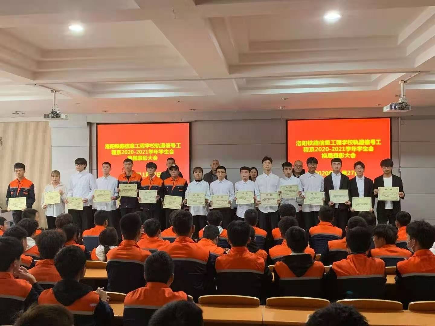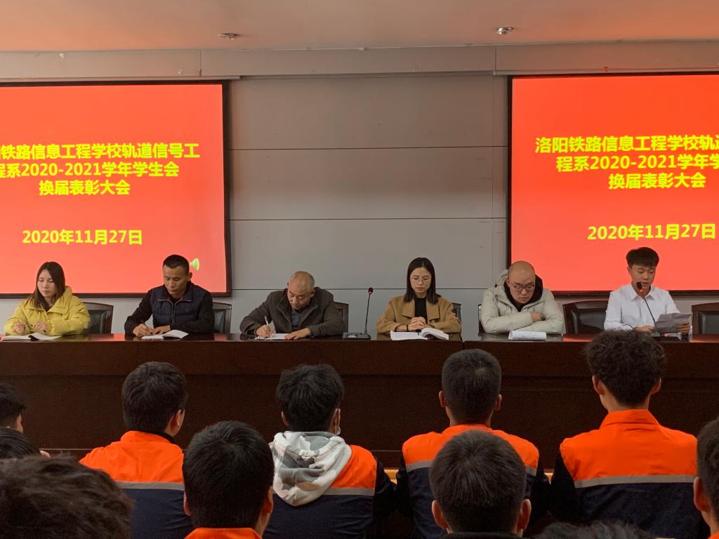 11月27日下午,轨道信号工程系在一号实训楼二楼多功能报告厅举行2020-2021学年学生会干部换届聘任暨表彰大会。轨道信号工程系党支部书记、系主任王民哲,副主任马瑞,学生会指导老师及全体学生干部参加会议。本次会议由学管干事王笑禹主持。