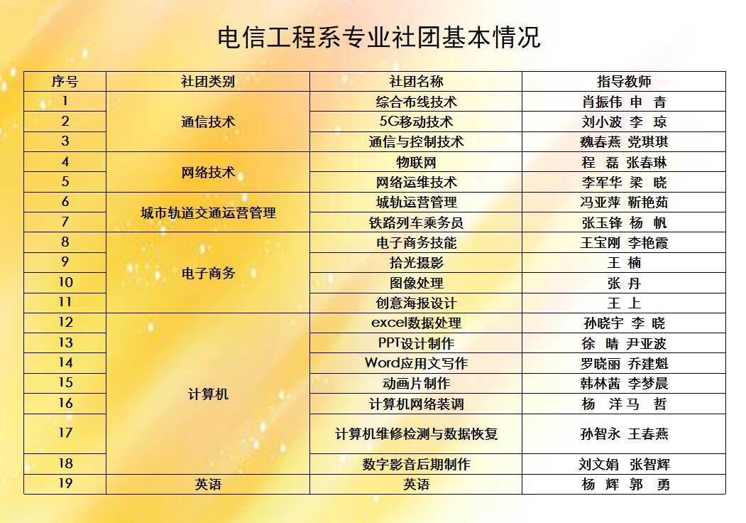 据了解,电信工程系依据专业特色和学生特点设置了通信技术类、网络技术类、电子商务类、城市轨道交通运营管理类、计算机类、英语类等六大类专业社团。教师结合自身研究专长和学生兴趣方向就某大类的一个方向申报成立社团,围绕具体领域开展工作,做到专业社团专业性与可操作性有机结合。