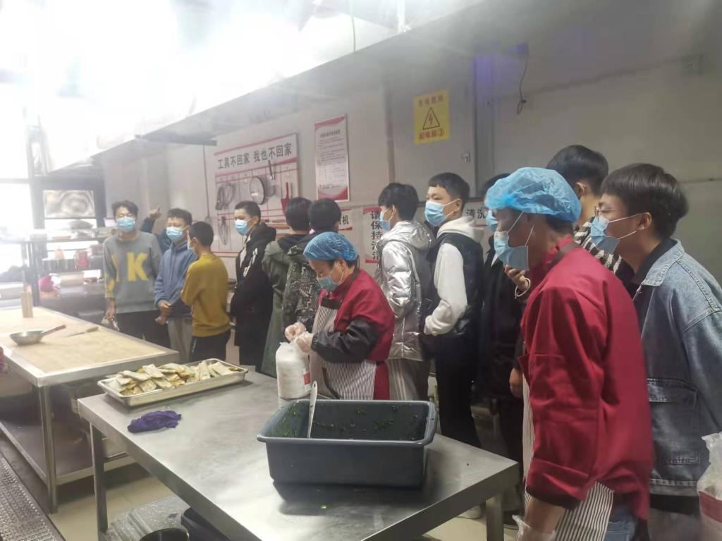 在餐厅服务人员的带领下,同学们参观了餐厅储藏间、洗菜间、烹饪间、售餐间等。餐厅负责人对餐饮食材的进货途径、货品质量、食品安全要求进行了详细介绍。