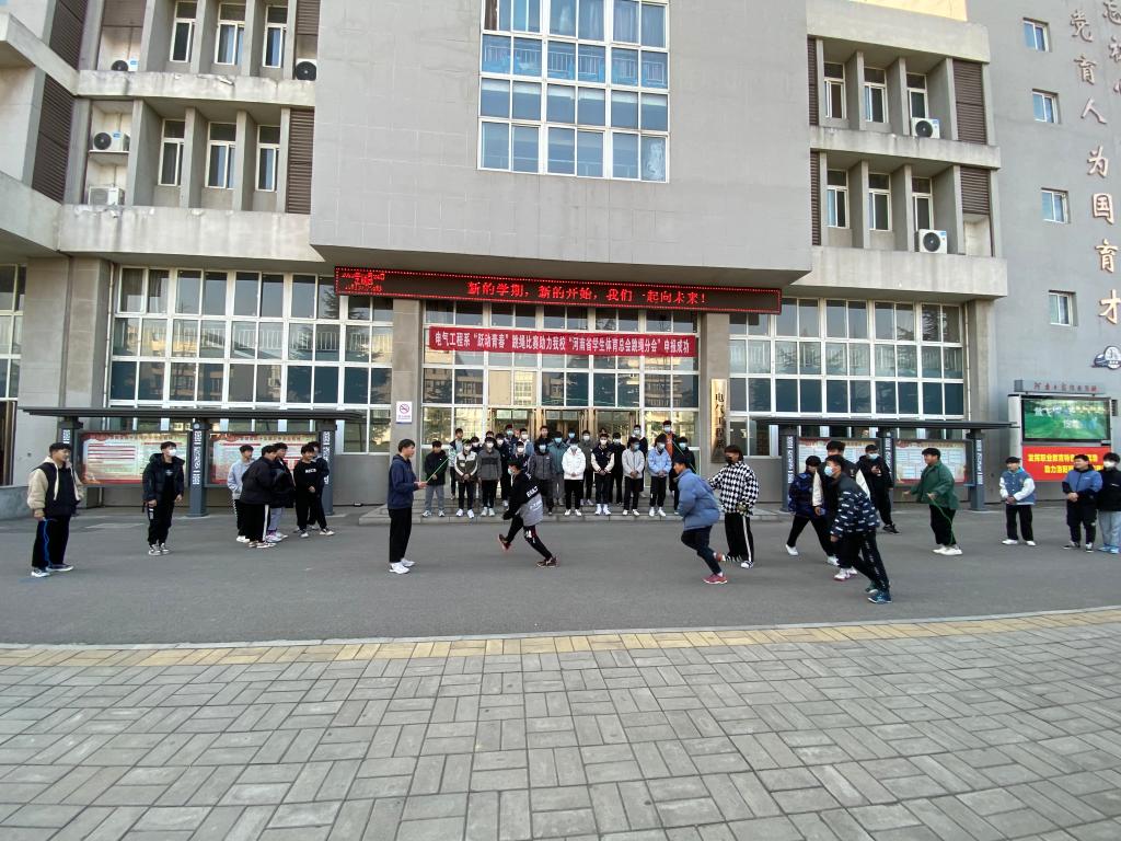 为丰富同学们的课余文化生活,展现学生的青春活力,增强班级凝聚力,助力学校“河南省学生体育总会跳绳分会”申报成功,在电气工程系党支部和系里的统一安排和组织下,全系所有班级参与的“跃动青春”花样跳绳比赛活动于2月22日拉开帷幕。