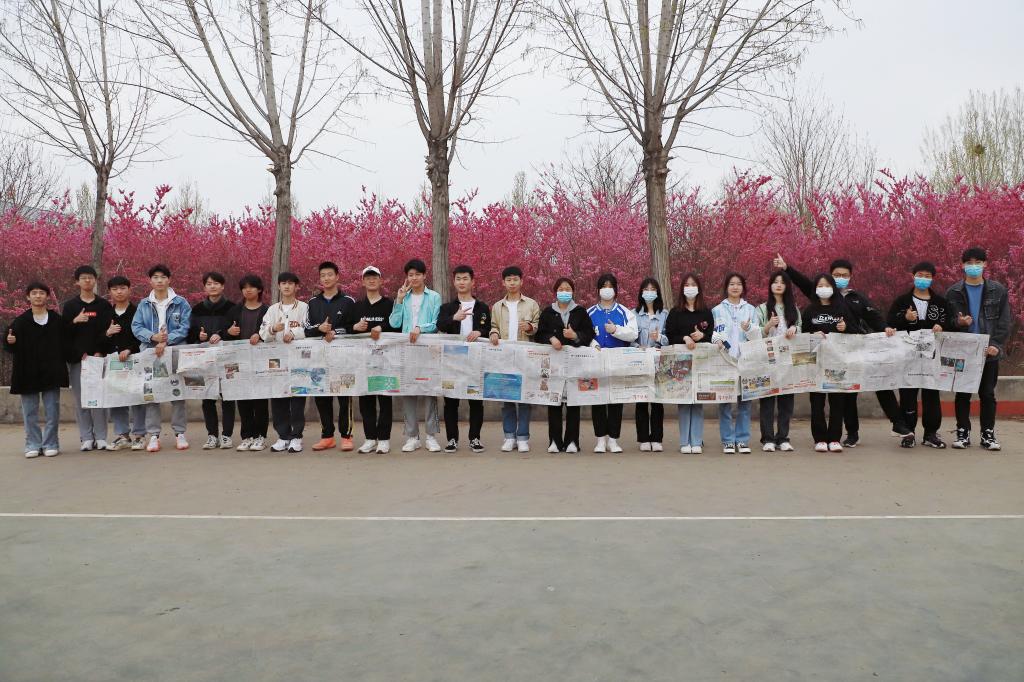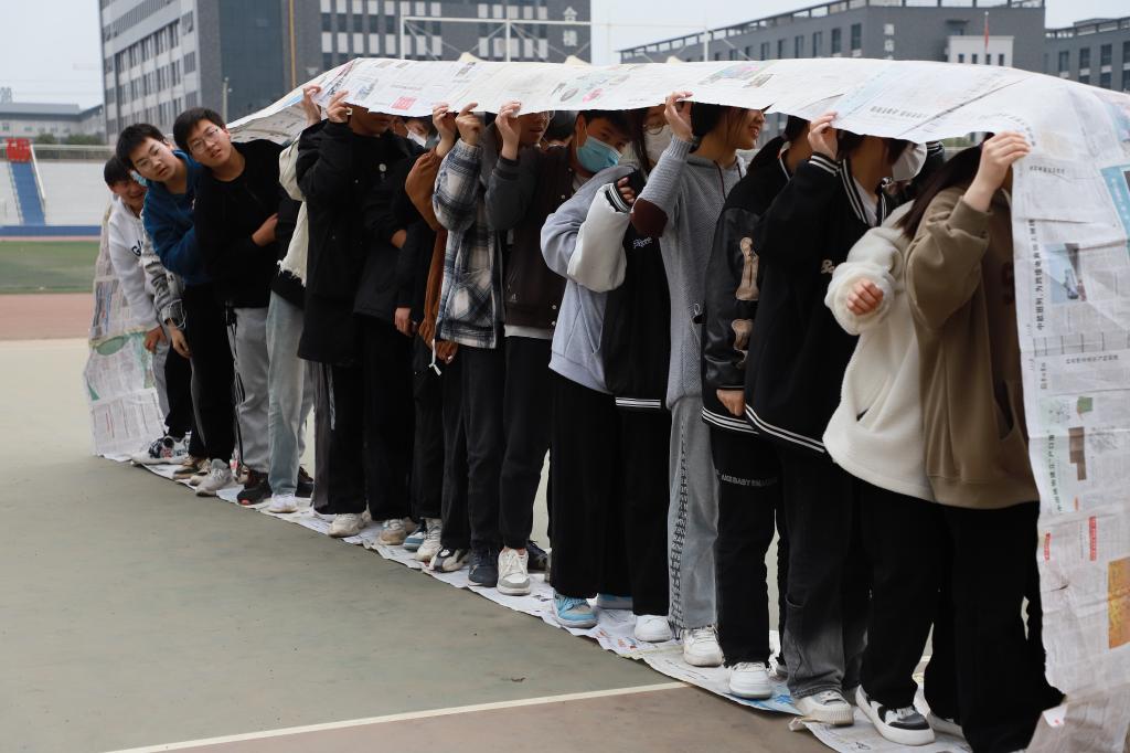 活动中,同学们分成两组,将废旧报纸组成了一个“风火轮”,22名同学们一起脚踩“风火轮”完成比赛线路。